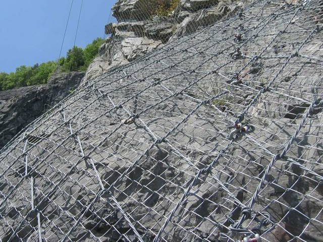 目前普通的边坡防护网已经不能满目当前边坡防护的要求,因为在一些高速公路上不仅需要拦截大块落石,而且小石块也需要对其拦截,这样才能保证公路的畅通。因此带高强度钢丝格栅的边坡防护网产品应运而生,外层是由钢丝绳编制而成的钢丝绳网,内层为高强度金属丝编织而成孔隙更小的钢丝网。